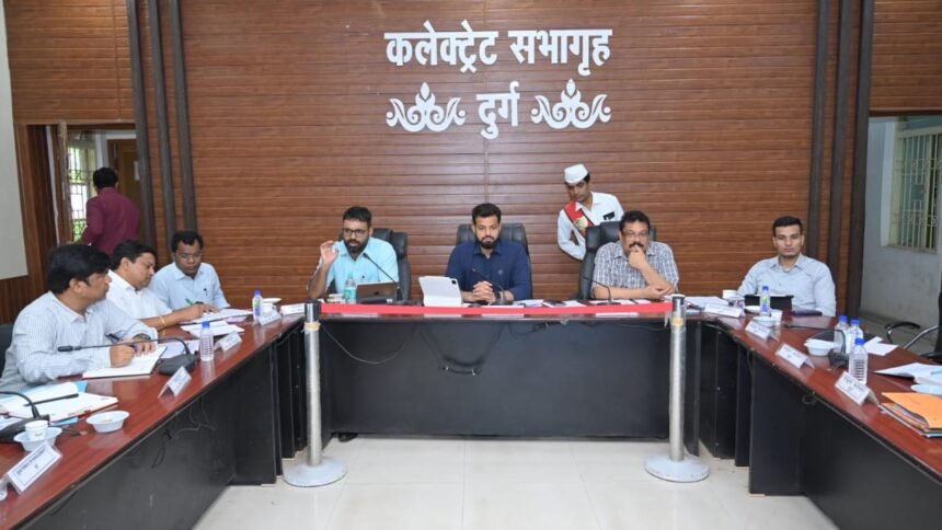दुर्ग। कलेक्टोरेट सभाकक्ष में कलेक्टर पुष्पेन्द्र कुमार मीणा की अध्यक्षता में आज राजस्व एवं नगरीय निकायों की समीक्षा बैठक आयोजित की गई। बैठक में अपर कलेक्टर अरविंद एक्का, भिलाई नगर निगम आयुक्त रोहित व्यास, दुर्ग नगर निगम आयुक्त लोकेश चन्द्राकर व रिसाली नगर निगम आयुक्त आशीष देवांगन के साथ एसडीएम एवं अन्य अधिकारी उपस्थित थे।