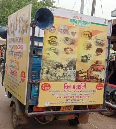 रायपुर (पीआईबी)। आजादी की 75वीं वर्षगांठ के अवसर पर प्रादेशिक लोक संपर्क कार्यालय (आरओबी) रायपुर द्वारा एकीकृत संचार तथा आउटरीच कार्यक्रमों (आईकॉप) के तहत 25 से 27 अगस्त, धमतरी जिले के कुरूद में ‘आजादी का अमृत महोत्सव’ शीर्षक से एक भव्यव चित्र प्रदर्शनी का आयोजन किया जा रहा है।