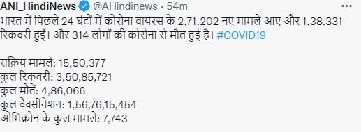 Reading: कोराना ने बढ़ाई चिंता: सक्रिय मरीज 15 लाख के पार, 2.71 लाख से अधिक मामले, 314 की मौत
