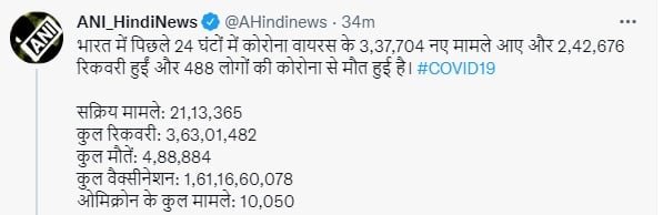 कोरोना के नए वैरिएंट ओमिक्रॉन के मामले भी लगातार बढ़ रहे हैं। देश में अब तक ओमिक्रॉन के कुल 10,050 मामले सामने आ चुके हैं। पिछले 24 घंटे में ओमिक्रॉन केस में 3.69 फीसदी की वृद्धि हुई है।