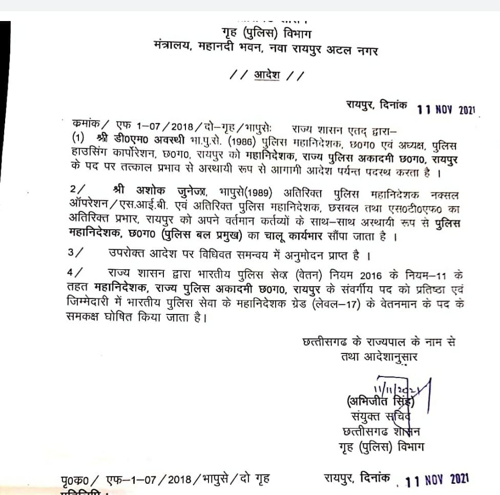 Reading: बड़ी खबर: हटाए गए डीएम अवस्थी…. अब अशोक जुनेजा होंगे छत्तीसगढ़ पुलिस के डीजीपी…. गृह विभाग ने जारी किया आदेश