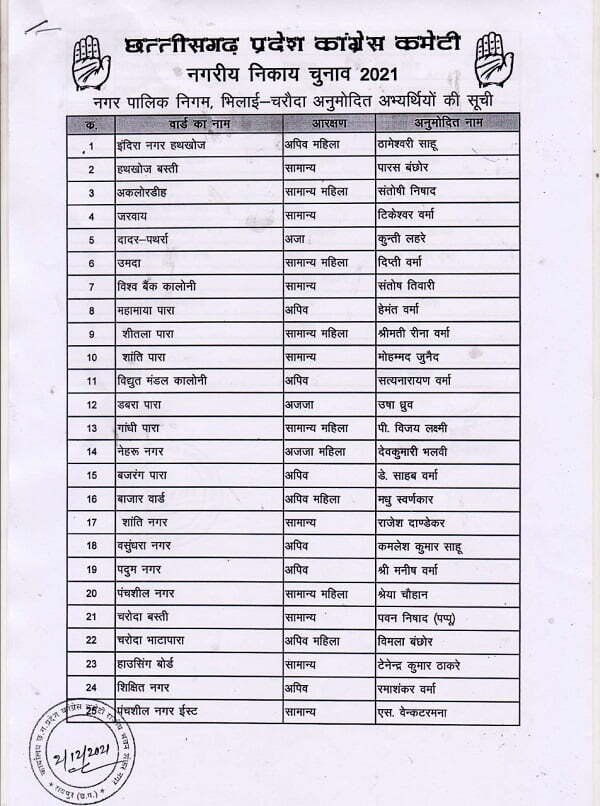कांग्रेस की सूची के अनुसार वार्ड 1 से रामेश्वरी साहू, वार्ड 2 से पारस बंछोर, वार्ड 3 से संतोषी निषाद, वार्ड 4 से टिकेश्वर वर्मा, वार्ड 5 से कुंती लहरें, वार्ड 6 से दीप्ति वर्मा, वार्ड 7 से संतोष तिवारी, वार्ड 8 से हेमंत वर्मा, वार्ड 9 से रीना वर्मा, वार्ड 10 से मोहम्मद जुनेद, वार्ड 11 से सत्यनारायण वर्मा, वार्ड 12 से उषा ध्रुव, वार्ड 13 से विजयलक्ष्मी, वार्ड 14 से देव कुमारी भलवी, वार्ड 15 से डे साहब वर्मा, वार्ड 16 से मधु स्वर्णकार, वार्ड 17 से राजेश दांडेकर, वार्ड 18 से कमलेश कुमार साहू, वार्ड 19 से मनीष वर्मा व वार्ड 20 से श्रेया चौहान को प्रत्याशी बनाया गया है।