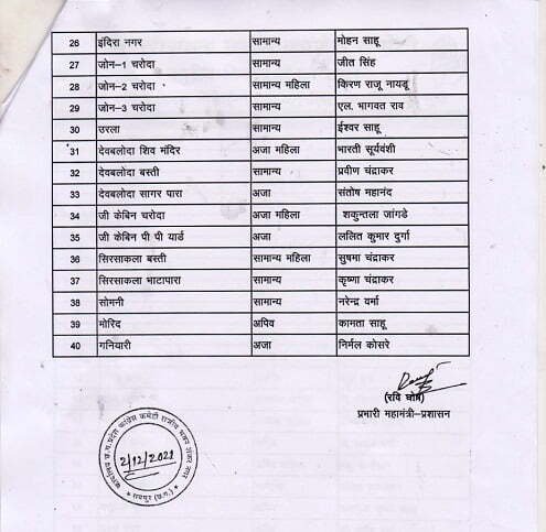 इसी प्रकार वार्ड 21 से पवन निषाद, वार्ड 22 से विमला बंछोर, वार्ड 23 से टोन इंद्र कुमार ठाकरे, वार्ड 24 से रमाशंकर वर्मा, वार्ड 25 से एस वेंकटरमना, वार्ड 26 से मोहन साहू, वार्ड 27 से जीत सिंह, वार्ड 28 से किरण राजू नायडू, वार्ड 29 भागवत राव, वार्ड 30 से ईश्वर साहू, वार्ड 31 से भारती सूर्यवंशी, वार्ड 32 से प्रवीण चंद्राकर, वार्ड 35 से संतोष महानंद, वार्ड 34 से शकुंतला जांगड़े, वार्ड 35 से ललित कुमार दुर्गा, वार्ड 36 से सुषमा चंद्राकर, वार्ड 37 से कृष्णा चंद्राकर, वार्ड 38 से नरेंद्र वर्मा, वार्ड 39 से कामता साहू व वार्ड 40 से निर्मल कोसरे को प्रत्याशी बनाया गया है।