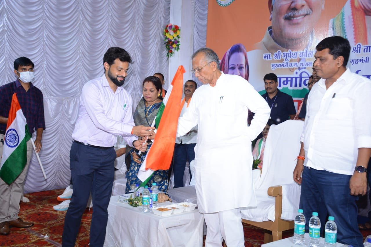 कार्यक्रम समापन के पहले कलेक्टर पुष्पेन्द्र मीणा ने गृहमंत्री ताम्रध्वज साहू को राष्ट्रीय ध्वज भेट किया। उन्होंने मंच से आग्रह किया राष्ट्रव्यापी अभियान में सभी शामिल होकर राष्ट्रप्रेम का परिचय दे। अपने-अपने निवास में अवश्य ध्वज रोहण करे। इस अवसर पर रिसाली निगम ने सभी अतिथियों को राष्ट्रध्वज उपलब्ध कराया।