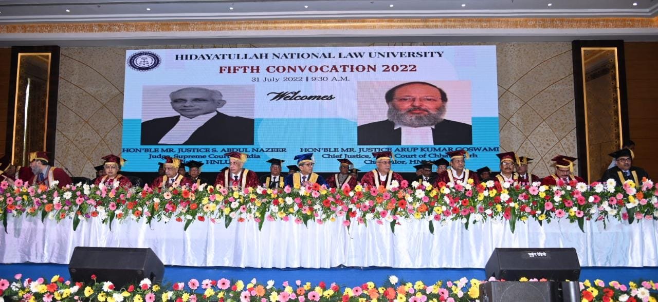 दीक्षांत समारोह में मुख्यमंत्री भूपेश बघेल विशिष्ट अतिथि के रूप में उपस्थित हैं। सर्वोच्च न्यायालय के न्यायाधिपति न्यायमूर्ति एस अब्दुल नजीर ने समारोह की अध्यक्षता की। इस अवसर पर छत्तीसगढ़ उच्च न्यायालय के मुख्य न्यायाधिपति न्यायमूर्ति तथा हिदायतुल्ला नेशनल लॉ यूनिवर्सिटी के कुलाधिपति अरूप कुमार गोस्वामी उपस्थित हैं। कार्यक्रम में छत्तीसगढ़ के विधि मंत्री मोहम्मद अकबर एवं शिक्षा मंत्री डॉ प्रेमसाय सिंह टेकाम भी उपस्थित हैं।