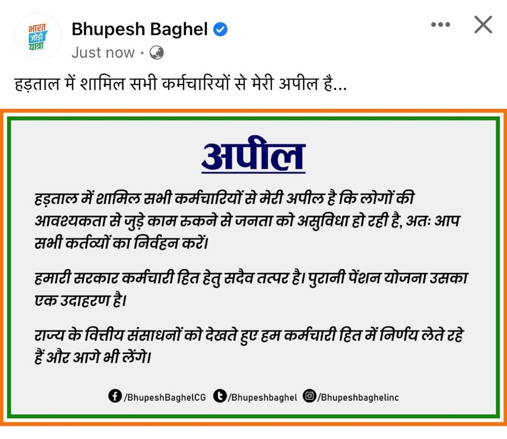 मुख्यमंत्री बघेल ने ट्वीट के माध्यम से अधिकारियों से अपील कर कहा की हड़ताल पर जाने से आम जनता का कामकाज कई दिनों से रुका हुआ है। अधिकारियों को कर्तव्यों का निर्वहन करने का निर्देश देते हुए मुख्यमंत्री ने कहा कि पुरानी पेंशन योजना इस बात की मिसाल है, सरकार अपने कर्मचारियों के हितों को सदैव ध्यान में रखकर फैसले लेती आई है।