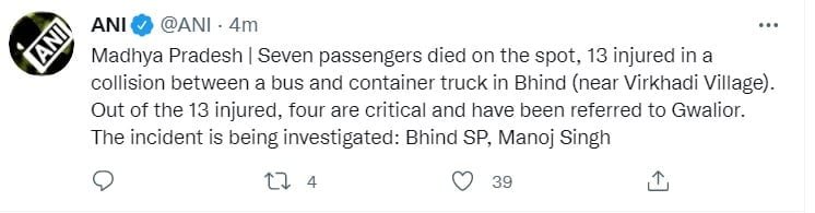 पुलिस अधीक्षक (एसपी) मनोज सिंह ने बताया कि विरखड़ी गांव के पास में बस और डंपर की टक्कर में सात यात्रियों की मौके पर ही मौत हो गई, 13 अन्या घायल हो गए घायलों में से चार की हालत गंभीर है और उन्हें ग्वालियर रेफर कर दिया गया है। घटना की जांच हो रही है।