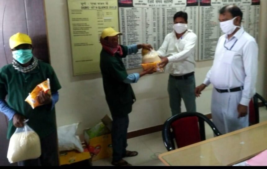 रायपुर। कोविड-19 के कारण राष्ट्रव्यापी लॉकडाउन के दौरान आवशयकमद लोगो को भोजन एवं भोजन सामग्री का वितरण किया जा रहा हैं । रायपुर रेल मंडल के कई कर्मचारी,अधिकारी, अपने अपने स्तर पर लोगों को भोजन सामग्री एवं तैयार भोजन का वितरण कर रहें हैं। इसी कड़ी में आज दुर्ग स्टेशन पर सुबह 11.00 बजे सफाई कर्मचारियों, हमाल्स, पार्किंग स्टाफ और आरएमएस स्टाफ के 60 जरूरतमंद ठेका मजदूरों के बीच स्टेशन मास्टर और गार्ड द्वारा सूखी खाद्य सामग्री वितरित की गई। इस दौरान सोशल डिस्टेन्स का ध्यान रखते हुए मास्क पहन कर भोजन सामग्री वितरित की गई।