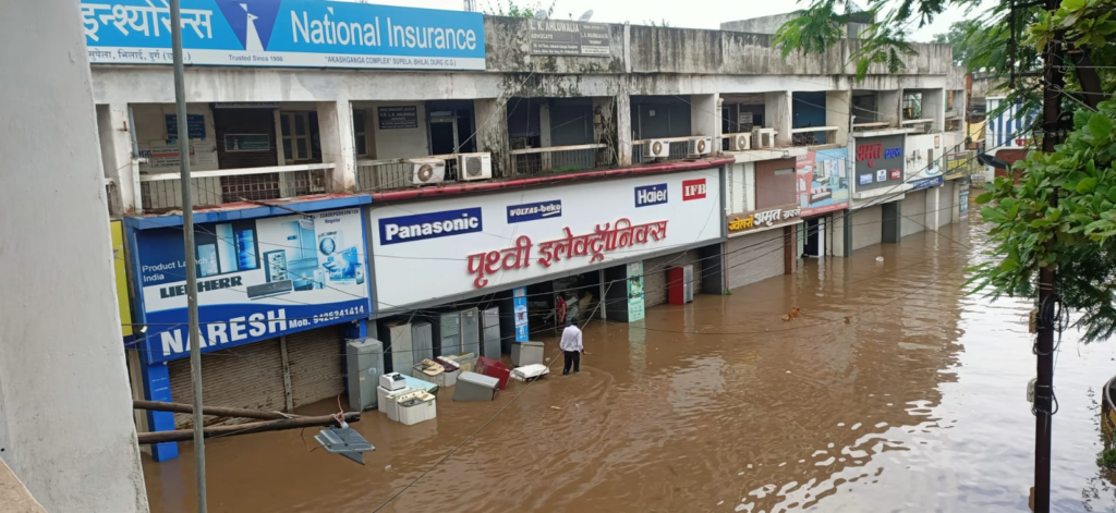 भिलाई। जन्माष्टमी के दिन गुरुवार की सुबह हुई बारिश के कारण पूरा शहर तरबतर हो गया है। भिलाई शहर की निचली बस्तियों में पानी भरना आम है लेकिन इस बार आकाशगंगा सुपेला बाजार पूरा पानी पानी हो गया। आकाशगंगा मार्केट के गार्डन सहित दुकानों में पानी भर गया। ज्वेलरी दुकानों से लेकिर फर्नीचर व इलेक्ट्रानिक दुकान जलमग्न हो गए। सड़क पर घुटनों तक पानी भर गया। इस दौरान दुकान दार निगम प्रशासन को कोसते दिखे।