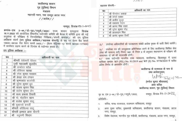 गृह विभाग से जारी सूची के अनुसार प्रमोशन पाने वालों में येशेश्वरी येरेवार, महालक्ष्मी कुलदीप, लम्बोदर पटेल, तोबियस खाखा, रमेश कुमार मरकाम, डेरहा राम टण्डन, कृष्णकांत बाजपेयी, सुरेश कुमार ध्रुव, संजय कुमार सिंह, संतोष कुमार जैन, सत्य प्रकाश तिवारी, मो. मोहसिन खान, राजेश कुमार साहू, सुशान्तो बनर्जी, कौशिल्या साहू, इफ्फत आरा खैरानी, यदुमणी सिदार शामिल है।