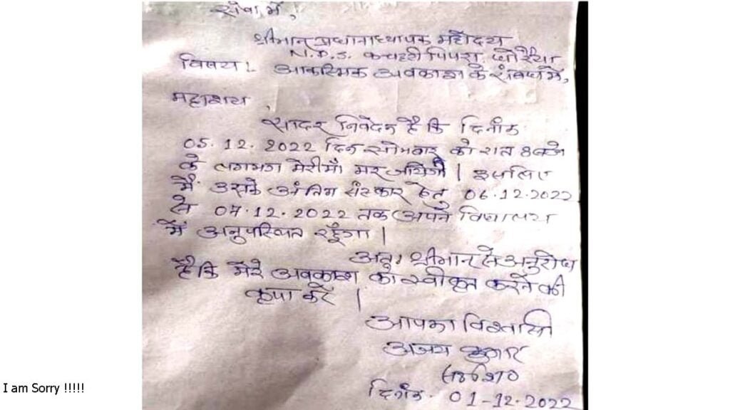 दरअसल शिक्षा विभाग के आवेदन में आकस्मिक छुट्टी के लिए आदेश आने के बाद शिक्षक दाह संस्कार की छुट्टी भी तीन पहले मांग रहे हैं। सोशल मीडिया पर ऐसे आवेदन वायरल हो रहे हैं। वायरल हो रही एक छुट्टी में शिक्षक अजय कुमार ने लिखा कि दिनांक 5 दिसंबर 2022 सोमवार को रात 8 बजे मेरी मां मर जाएगी। इसलिए मैं उसके अंतिम संस्कार हेतु 6 दिसंबर से 7 दिसंबर कर अपने विद्यालय में अनुपस्थित रहूंगा। वहीं एक दूसरे एप्लीकेशन में लिखा शिक्षक राज गौरव ने लिखा कि दिनांक 4 दिसंबर से 5 दिसंबर तक बीमार रहूंगा, जिसकी वजह से मैं विद्यालय नहीं आ पाऊंगा।