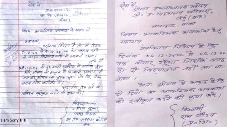 दरअसल, मुंगेर, भागलपुर और बांका जिलों में शिक्षा विभाग की तरफ से शिक्षकों के आकस्मिक अवकाश मांगे जाने के संबंध में एक नया आदेश जारी किया गया है जिसमें ये कहा गया है कि आकस्मिक अवकाश के लिए शिक्षकों को 3 दिन पहले आवेदन देवा होगा। ऐसा नहीं करने पर उनकी छुट्टी स्वीकृत नहीं होगी। इस आदेश के बाद आक्रोशित शिक्षक इस तरह से आवेदन लिख रहे हैं।