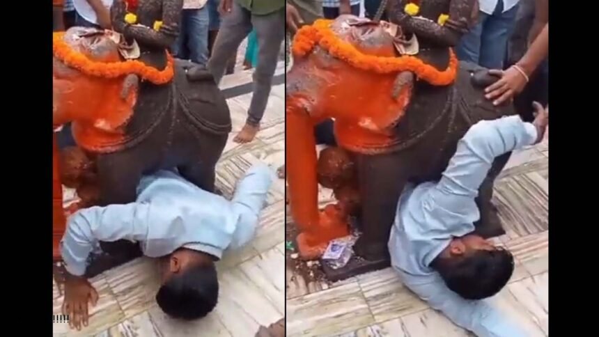 भिलाई। हमारे देश में मन्नत पूरी करने के लिए कोई क्या नहीं करता है। देश में ऐसे कई मंदिर हैं जहां पर व्यक्ति अपनी मन्नत लेकर जाता है और उन मंदिरों में मन्नत पूरी करने का सिस्टम भी अलग होता है। सोशल मीडिया पर ऐसा ही एक वीडियो तेजी से वायरल हो रहा है जिसमें एक शख्स हाथी की पत्थर से तरासी गई प्रतिमा के पैरो के नीचे गुजर रहा है। लेकिन वह पूरा नहीं निकल पा रहा है। उसकी कमर से ऊपर का हिस्सा एक तरफ और दूसरा हिस्सा दूसरी तरफ। वायरल वीडियो को छत्तीसगढ़ के आईपीएस दीपांशु काबरा ने भी शेयर किया है।