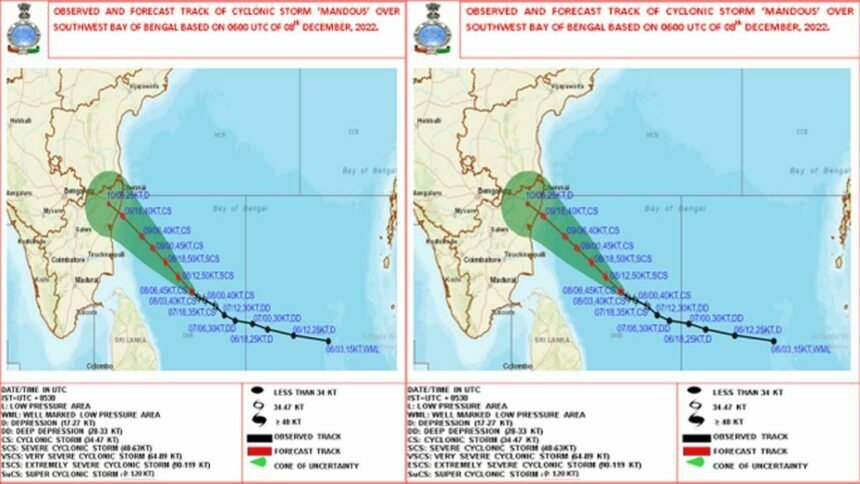 भारतीय मौसम विभाग (IMD) के मुताबिक बंगाल की खाड़ी के ऊपर बना कम दबाव का क्षेत्र अब गहरे दबाव में बदल गया है। कराईकल से लगभग 420 किमी ईएसई पर चक्रवाती तूफान मैंडूस गुरुवार शाम तक तेज हो गया। चंक्रवाती तूफान 9 दिसंबर की आधी रात तक महाबलीपुरम के आसपास उत्तर तमिलमाडु, दक्षिण आंध्र प्रदेश, पुडुचेरी और श्रीहरिकोटा को पार कर सकता है। इससे भारी बारिश की चेतावनी दी गई है।