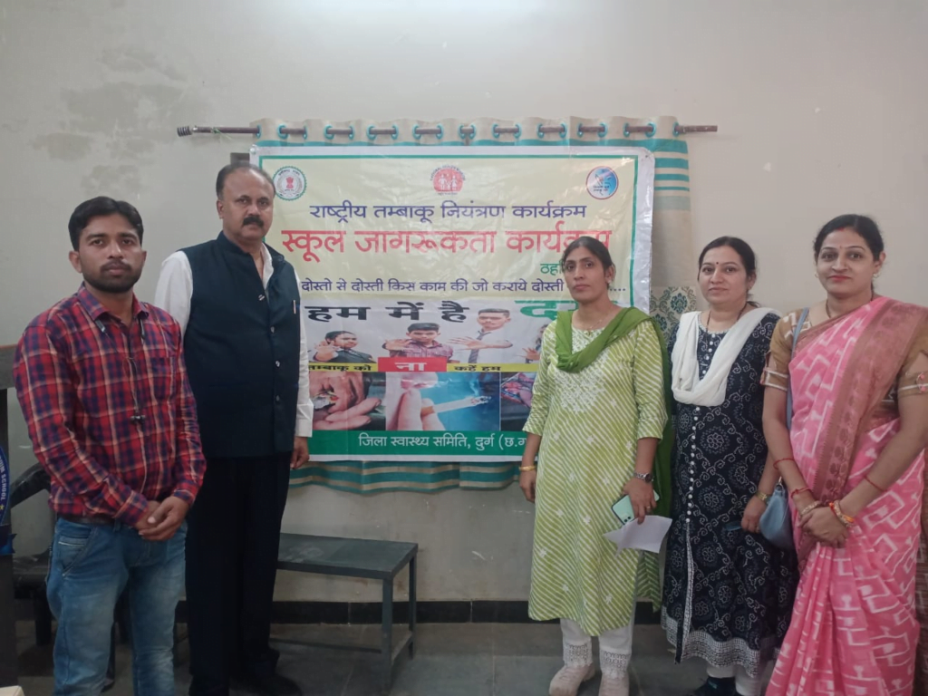 दुर्ग। मुख्य चिकित्सा एवं स्वास्थ्य अधिकारी डॉ. जे. पी. मेश्राम के निर्देशन एवं राष्ट्रीय तंबाकू नियंत्रण कार्यक्रम के नोडल अधिकारी डॉ.आर.के खंडेलवाल के मार्गदर्शन में स्वामी आत्मानंद अंग्रेजी माध्यम स्कूल रिसाली में किया गया। स्कूल के प्राचार्य पी. रमेश के द्वारा तम्बाकू सेवन से नुकसान की बहुत अच्छी जानकारी दी गई। छात्र छात्राओं को तंबाकू सेवन से होने वाले नुकसान के विषय में चित्रकला प्रतियोगिता का आयोजन किया गया। छात्र-छात्राओं द्वारा बढ़ चढ़कर हिस्सा लिया गया एवं तंबाकू सेवन से होने वाले हानिकारक दुष्परिणाम को चित्र के माध्यम से बहुत ही अच्छे तरीके से प्रदर्शित किया गया। जिसमें व्यक्ति किसी भी प्रकार के नशे का सेवन करता हैं तो उसके नशे से उसका और उसके परिवार की बहुत ही नुकसान होता है।