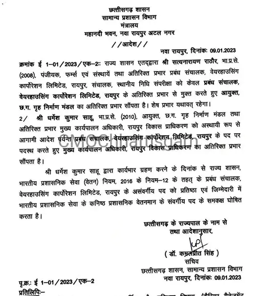 सामान्य प्रशासन विभाग द्वारा जारी आदेश के अनुसार 2008 बैच के आईएएस अधिकारी सत्यनारायण राठौर को वेयरहाउसिंग कॉर्पोरेशन के प्रबंध संचालक पद से मुक्त कर छत्तीसगढ़ गृह निर्माण मंडल के आयुक्त की अतिरिक्त जिम्मेदारी दी गई है। इनके पास पंजीयक फर्म्स एवं संस्थाएं और स्थानीय निधि संपरीक्षा के संचालक की जिम्मेदारी भी है। इसी प्रकार 2010 बैच के आईएएस धर्मेश साहू को वेयरहाउसिंग कॉर्पोरेशन का प्रबंध संचालक बनाया गया है।