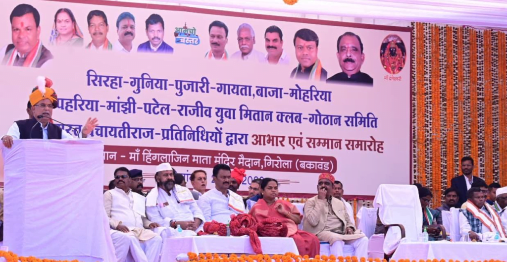रायपुर। मुख्यमंत्री भूपेश बघेल आज बस्तर जिले के बकावंड विकासखण्ड के ग्राम गिरोला में सिरहा, गुनिया, गायता, पुजारी, मांझी, बाजा-मोहरिया, आठ पहरिया, राजीव युवा मितान क्लब, गोठान समिति और पंचायती राज प्रतिनिधि द्वारा आयोजित आभार एवं सम्मान समारोह में शामिल हुए। उन्होंने समारोह को सम्बोधित करते हुए कहा कि बस्तर बदल रहा है। बस्तर में शांति और विकास की बयार बह रही है।