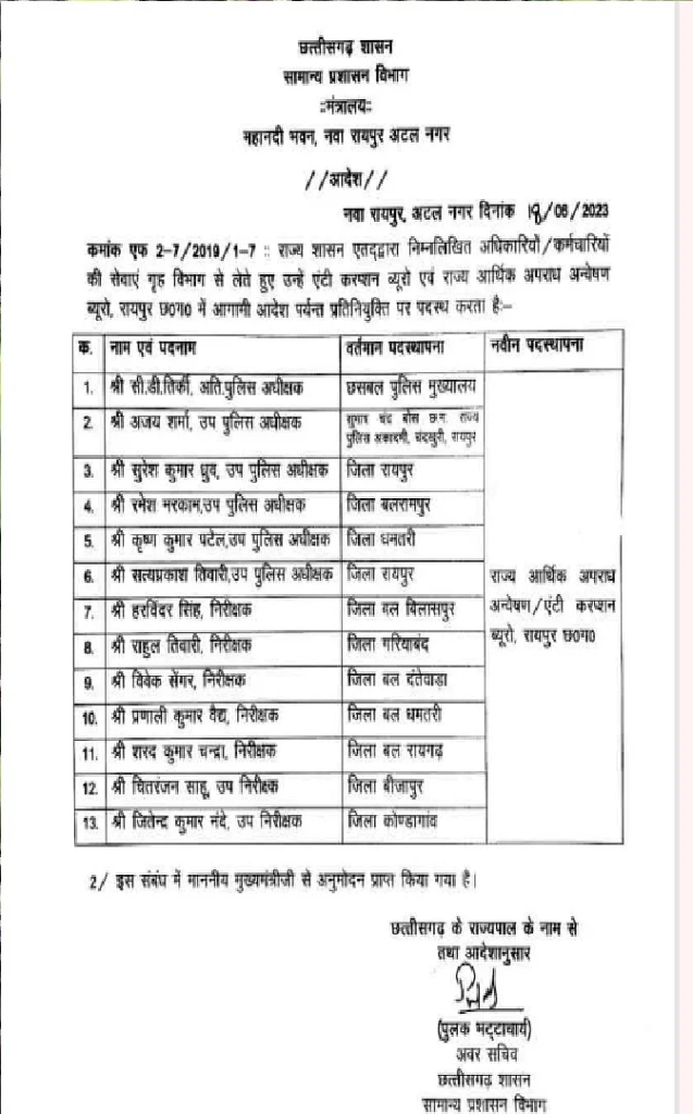 रायपुर। छत्तीसगढ़ शासन ने राज्य पुलिस सेवा के 13 अधिकारियों की प्रतिनियुक्ति दी है। प्रतिनियुक्ति पाने वालों में एएसपी, डीएसपी से लेकर निरीक्षक रेंज के अफसर शामिल हैं। इन सभी पुलिस अधिकारियों को ACB/EOW में  प्रतिनियुक्ति दी गई है। इसे लेकर छत्तीसगढ़ सामान्य प्रशासन विभाग ने आदेश जारी कर दिया है। रायपुर, धमतरी, बिलासपुर, गरियाबंद, दंतेवाड़ा के चिह्नित पुलिस अधिकारियों को इसमें शामिल किया गया है।