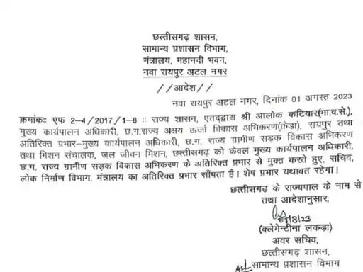 इसी प्रकार आईएएस भुवनेश यादव को महिला एवं बाल विकास विभाग का सचिव और वाणिज्य एवं उद्योग तथा सार्वजनिक उपक्रम विभाग के सचिव और निशक्तजन विभाग के आयुक्त का अतिरिक्त प्रभार सौंपा गया है। इसी प्रकार आईएएस भीम सिंह को छत्तीसगढ़ राज्य ग्रामीण सड़क विकास अभिकरण का मुख्य कार्यपालन अधिकारी के अतिरिक्त प्रभार दिया गया है। आईएएस अलोक कटियार को लोक निर्माण विभाग के सचिव पद का अतिरिक्त प्रभार सौंपा गया है।
