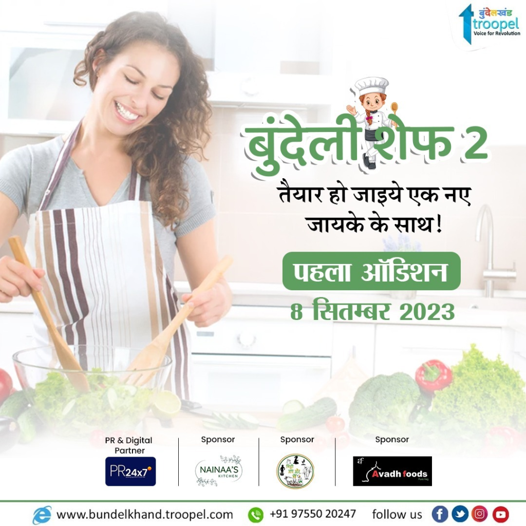 बुंदेलखंड क्षेत्र की पहली ऑनलाइन शेफ प्रतियोगिता बुंदेली शेफ एक बार फिर, देशवासियों के सामने बुंदेली जायके का स्वाद लेकर आ रहा है. बुंदेलखंड ट्रूपल द्वारा आयोजित क्षेत्र की पहली शेफ प्रतियोगिता के दूसरे सीजन की शुरुआत 8 सितम्बर को पहले ऑडिशन के साथ होगी. जबकि कुल 6 ऑडिशन, 2 क्वाटर फाइनल, सेमीफाइनल व दिसंबर के पहले सप्ताह में होने वाले फाइनल के साथ, यह प्रतियोगिता लगभग 3 महीने चलेगी. इच्छुक उम्मीदवार https://bit.ly/bundelichef के माध्यम से रजिस्ट्रेशन करा, प्रतियोगिता का हिस्सा बन सकते हैं. कार्यक्रम के माध्यम से मध्यप्रदेश व उत्तरप्रदेश में आने वाले बुंदेलखंड के सभी जिलों समेत क्षेत्र से संबंधित अन्य शहरों की रहवासी महिलाएं भी हिस्सा ले सकती हैं। विजेता प्रतिभागी को 50 हजार तक के पुरस्कार ससम्मान भेंट किए जाएंगे. जिसके अंतर्गत सेल्फ डिजिटल ब्रांडिंग से लेकर आकर्षक गिफ्ट आइटम्स शामिल हैं.