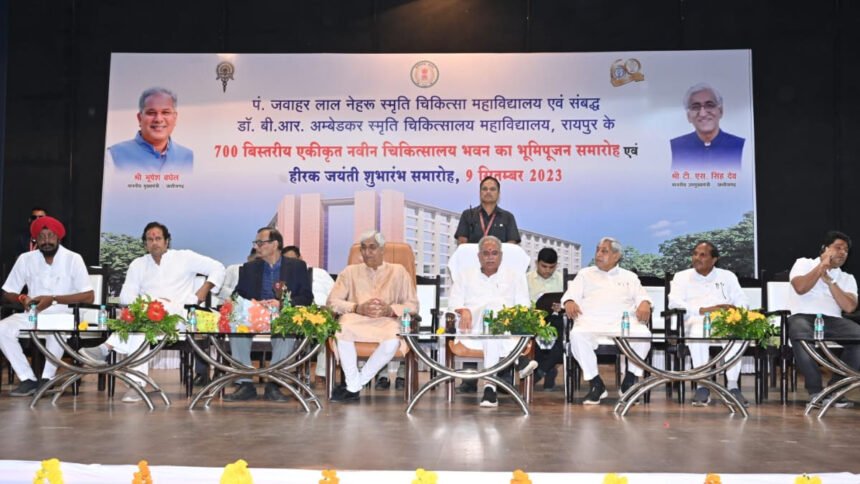 रायपुर। मुख्यमंत्री भूपेश बघेल ने शनिवार को रायपुर के पंडित जवाहर लाल नेहरू चिकित्सा महाविद्यालय में 700 बिस्तर क्षमता वाले नए एकीकृत चिकित्सालय भवन का भूमिपूजन किया। चिकित्सा महाविद्यालय से संबद्ध अस्पताल के लिए 322 करोड़ रुपए की लागत से आधुनिक सर्वसुविधायुक्त चिकित्सालय भवन का निर्माण शीघ्र प्रारंभ होगा। मुख्यमंत्री बघेल ने मेडिकल कॉलेज ऑडिटोरियम में महाविद्यालय के हीरक जयंती समारोह का शुभारंभ भी किया।