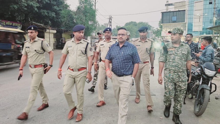 दुर्ग। जिले के एसपी राम गोपाल गर्ग ने बुधवार को शहर के अलग अलग बाजारों में पैदल पेट्रोलिंग की। आगमी त्योहारी सीज़न व चुनाव को देखते हुए शहर के भीड़भाड़ वाले इलाकों, बाजारों में सुरक्षा व्यवस्था को लेकर अफसरों को आवश्यक दिशा निर्देश भी दिए। एसपी गर्ग ने गंजपारा से चंडी मन्दिर, तमेर पारा , मोती कॉम्प्लेक्स, पुराना बस स्टैंड , पटेल चौक मार्ग में लगभग 5 किमी की पैदल पेट्रोलिंग की। इस दौरान उनके साथ अतिरिक्त पुलिस अधीक्षक शहर अभिषेक झा, डीएसपी यातायात सतीश ठाकुर सहित अन्य अफसर व 20 से अधिक जवान भी शामिल रहे।