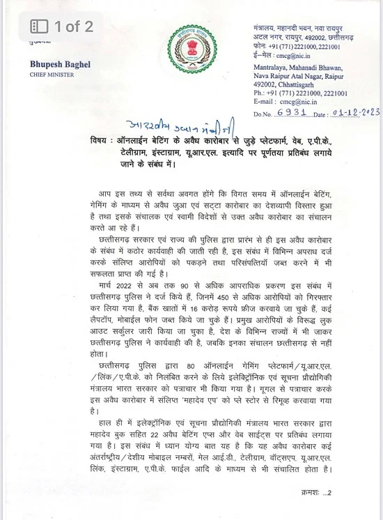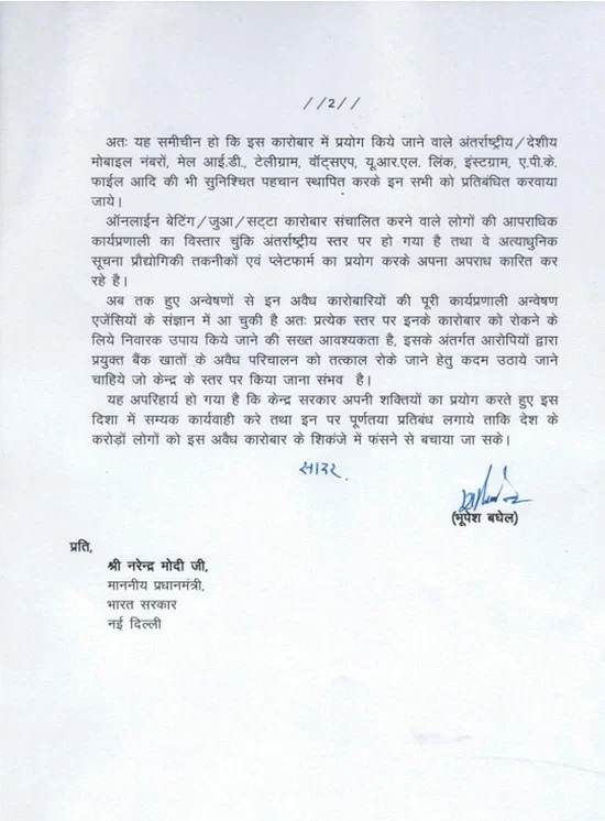सीएम बघेल ने आगे कहा है कि ऑनलाईन बेटिंग/जुआ/सट्टा कारोबार संचालित करने वाले लोगों की आपराधिक कार्यप्रणाली का विस्तार चूंकि अंतर्राष्ट्रीय स्तर पर हो गया है तथा वे अत्याधुनिक सूचना प्रौद्योगिकी तकनीकों एवं प्लेटफार्म का प्रयोग कर अपराध कर रहे हैं। अब तक हुए जांच से इन अवैध कारोबारियों की पूरी कार्यप्रणाली जांच एजेंसियों के संज्ञान में आ चुकी है। इसलिए प्रत्येक स्तर पर इनके कारोबार को रोकने के लिये निवारक उपाय किये जाने की सख्त आवश्यकता है, इसके अंतर्गत आरोपियों द्वारा प्रयुक्त बैंक खातों के अवैध परिचालन को तत्काल रोके जाने हेतु कदम उठाये जाने चाहिये जो केन्द्र के स्तर पर किया जाना संभव है। यह अपरिहार्य हो गया है कि केन्द्र सरकार अपनी शक्तियों का प्रयोग करते हुए इस दिशा में सम्यक कार्यवाही करे तथा इन पर पूर्णतया प्रतिबंध लगाये ताकि देश के करोड़ों लोगों को इस अवैध कारोबार के शिकंजे में फंसने से बचाया जा सके।