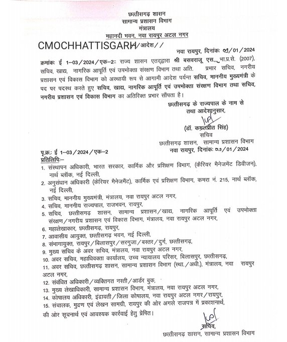 रायपुर। राज्य शासन द्वारा भारतीय प्रशासनिक सेवा के अधिकारी बसवराजू एस. की पदस्थापना सचिव, माननीय मुख्यमंत्री के रूप में की गई है। उन्हें खाद्य एवं नागरिक आपूर्ति उपभोक्ता संरक्षण विभाग एवं नगरीय प्रशासन विभाग के सचिव का अतिरिक्त प्रभार भी दिया गया है।