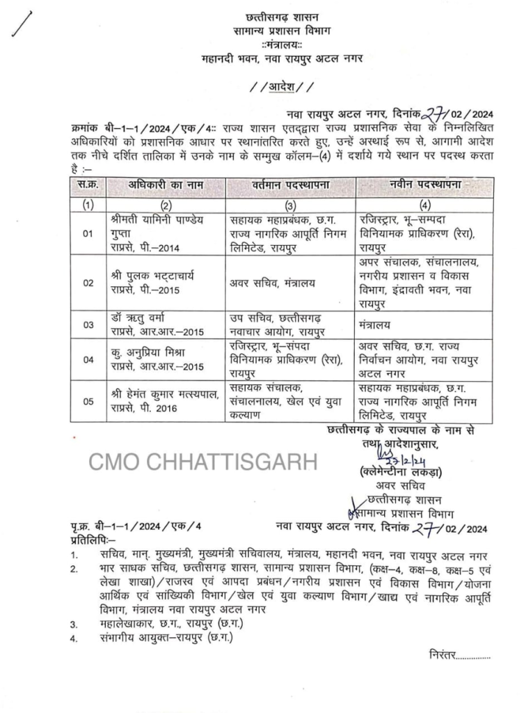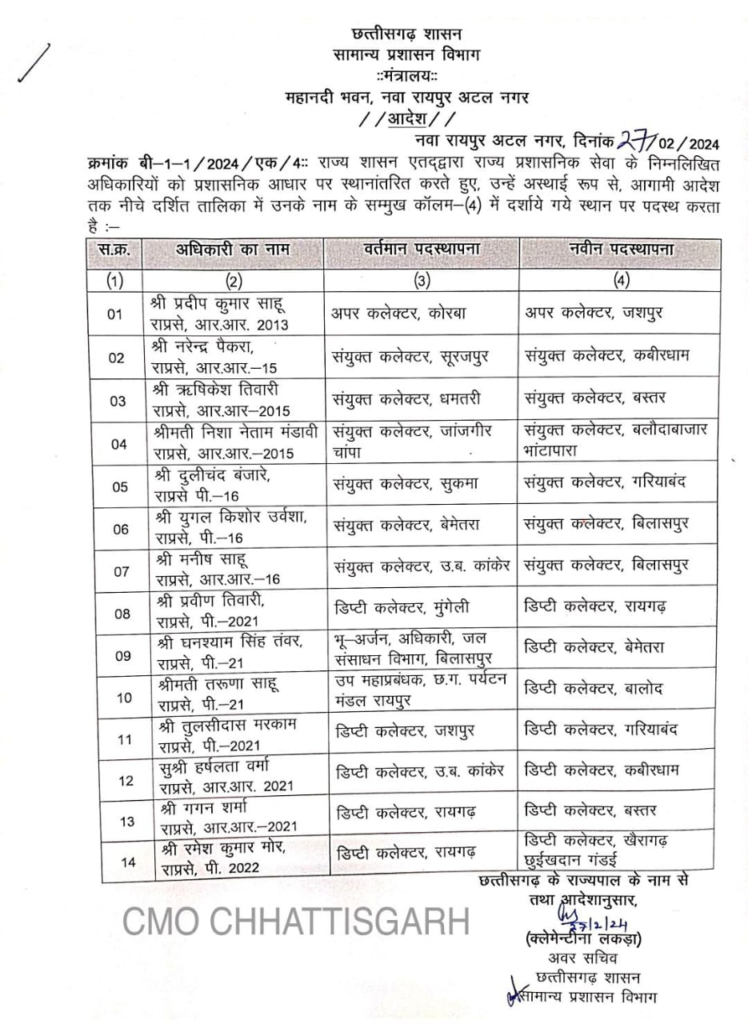 रायपुर। राज्य सरकार ने मंगलवार को 19 राज्य प्रशासनिक सेवा के अफसरों का तबादला किया है। जिसमें अपर, संयुक्त और डिप्टी कलेक्टर स्तर के अधिकारी शामिल हैं। यह सभी अधिकारी अलग-अलग विभागों में पदस्थ थे। एक दिन पहले भी राज्य प्रशासनिक सेवा के कई अफसरों का तबादला किया गया। इस संंबंध में सामान्य प्रशासन विभाग द्वारा आदेश जारी कर दिया गया है।