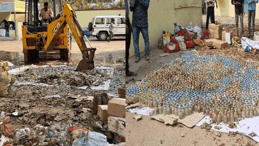 बेमेतरा पुलिस ने नष्ट कर दी 1783 लीटर शराब, कोर्ट के आदेश पर बुलडोजर से कुचलवाया