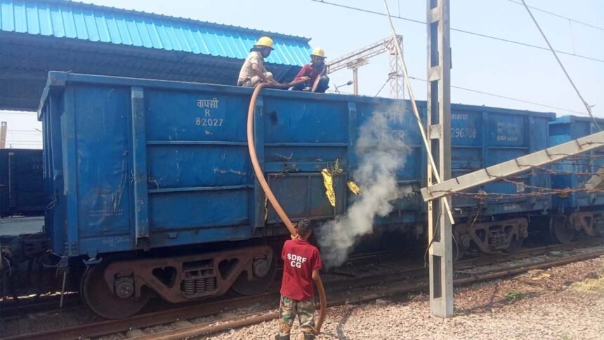 भिलाई। कोयले से भरी मालगाड़ी की बोगी में आग लगने से हड़कंप मच गया। भिलाई नगर रेलवे स्टेशन पर खड़ी ट्रेन की बोगी में आग लगने पर फायर ब्रिगेड को कॉल किया गया। मौके पर पहुंची फायर ब्रिगेड की टीम ने समय रहते आग पर काबू पा लिया। घटना मंगलवार दोपहर लगभग 2:30 बजे की है।