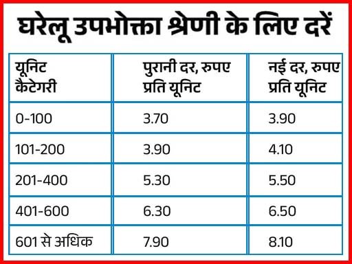 नई दरें लागू होने के बाद 0-100 यूनिट तक खपत पर पहले प्रति यूनिट 3.70 रुपए चार्ज लगता था जो अब 3.90 रुपए लगेगा। 101-200 यूनिट पर पहले 3.90 लगता था जो अब 4.10 लगेगा। इसी प्रकार 201-400 तक पहले 5.30 रुपए लग रहा था जो अब 5.50 रुपए प्रति यूनिट लिया जाएगा। 401-600 यूनिट खपत पर पहले 6.30 रुपए लग रहा था जो अब 6.50 रुपए प्रति यूनिट की दर से देना होगा। 601 यूनिट से अधिक की खपत पर पहले 7.90 रुपए प्रति यूनिट लग रहा था जो कि अब 8.10 रुपए प्रति यूनिट देना होग। इसके अलावा कृषि उपभोक्ताओं को पहले 5.05 रुपए की दर से चार्ज लगता था जो अब 5.30 रुपए हो गया है।