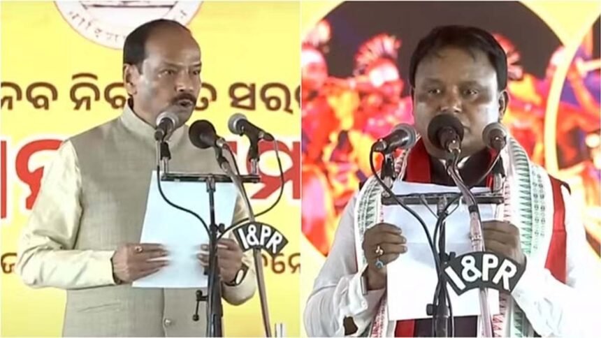 भुवनेश्वर। विधानसभा चुनाव में पूर्ण बहुमत के साथ भाजपा ने ओडिशा में सरकार बनाई है। बुधवार को ओड़िशा में भाजपा की सरकार का शपथ ग्रहण समारोह हुआ। क्योंझर से विधायक मोहन चरण माझी ने ओडिशा में भाजपा के पहले मुख्यमंत्री के रूप में शपथ ली। उनके साथ केवी सिंह देव और प्रभाती परिदा ने राज्य के उप मुख्यमंत्री के रूप में शपथ ली। इसी के साथ ओडिशा में पहली बार एक सीएम, दो डिप्टी सीएम और 13 मंत्रियों की सरकार बनी।