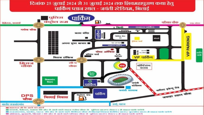 भिलाई। जयंती स्टेडियम परिसर भिलाई में 25 से 31 जुलाई तक अंतर्राष्ट्रीय कथा वाचक पं. प्रदीप मिश्रा (सिहोर वाले) का शिव महापुराण कथा आयोजन प्रस्तावित है। शिव महापुराण कथा के दौरान लाखों की भीड़ को देखते हुये यातायात पुलिस द्वारा श्रद्धालुओं के लिए सुरक्षित यातायात व्यवस्था को ध्यान में रखते हुए रायपुर, बेमेतरा, बालोद, राजनांदगांव की ओर से कथा स्थल तक आने-जाने के लिए निम्नानुसार मार्ग,पार्किंग एवं डायवर्शन प्लान तैयार निर्धारित किया गया है।