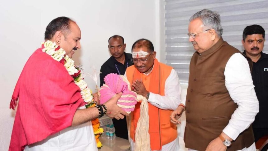 मुख्यमंत्री साय ने सुप्रसिद्ध कथावाचक पंडित प्रदीप मिश्रा से की मुलाकात, भेंट की बेलमेटल की नंदी