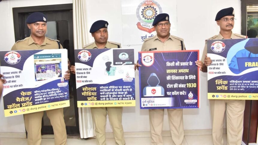 दुर्ग रेंज आईजी रामगोपाल गर्ग के मार्गदर्शन एवं पुलिस अधीक्षक दुर्ग जितेन्द्र शुक्ला निर्देश पर राज्य व्यापी साइबर जन जागरूकता पखवाड़ा अभियान की शुरुआत हुई।अभियान के प्रथम दिवस ट्रेंडिंग साइबर ठगी के संबंध में अपराध को वीडियो के माध्यम से जरिए सोशल मीडिया में दिखाकर जागरूक किया गया। दुर्ग के सभी थाना व चौकी द्वारा अपने क्षेत्रों में सार्वजनिक स्थान, चौक चौराहों, वर्कशॉप, स्कूल/कॉलेजों में साइबर क्राइम के प्रति लोगो को पाम्पलेट वितरण कर बैनर पोस्टर के जरिये प्रचार-प्रसार कर जागरूक किया गया।