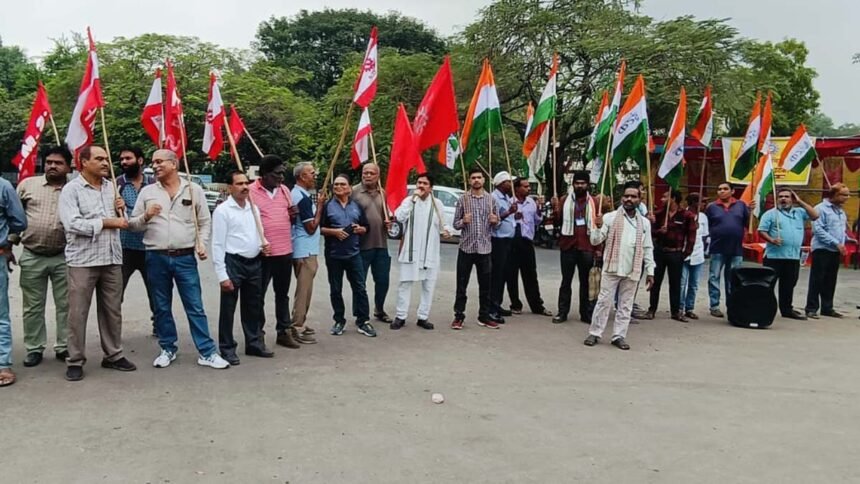 भिलाई। 39 माह के एरियर्स सहित अन्य मांगों को लेकर भिलाई स्टील प्लांट की सभी यूनियनों द्वारा सोमवार को एक दिवसीय हड़ताल शुरू की। प्लांट में हड़ताल का असर दिख रहा है। सुबह पांच बजे से ही यूनियन के नेता व कर्मचारी प्लांट के गेट पर जमा होने लगे। संयुक्त यूनियनों की हड़ताल का प्लांट के कर्मचारियों ने भी समर्थन किया है। इसके कारण प्लांट में प्रोडक्शन प्रभावित हो रहा है। अधिकारी पूरी स्थिति पर नजर रखे हुए हैं। इस हड़ताल में बीएसपी की 11 ट्रेड यूनियन शामिल हैं। किसी भी स्थिति से निपटने के लिए भारी संख्या में पुलिस और सीआईएसएफ में जवानों ने मोर्चा संभाला है।
