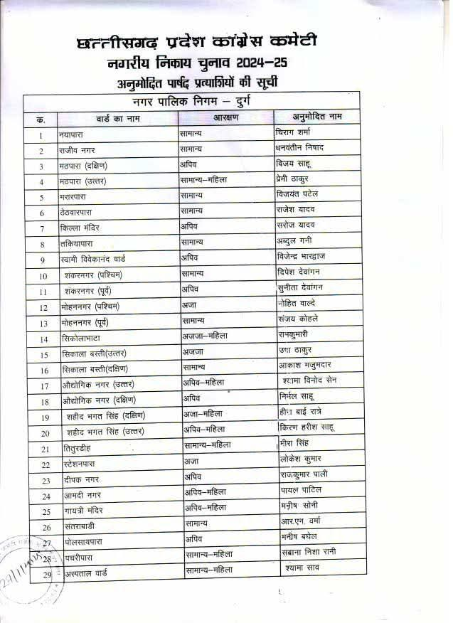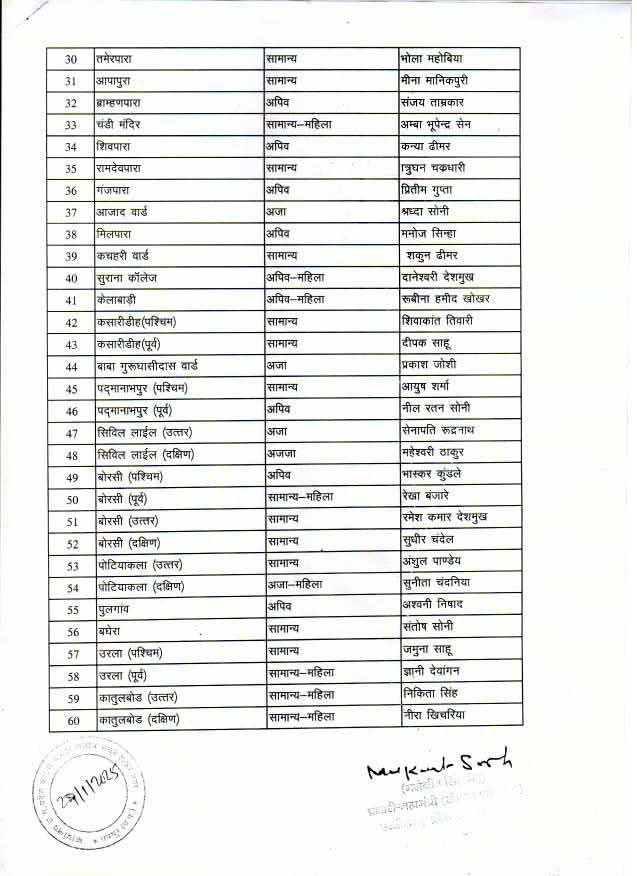 वार्ड क्रमांक 1 से चिराग शर्मा, वार्ड क्रमांक 2 धनवनतीं निषाद, वार्ड क्रमांक 3 विजय साहू, वार्ड क्रमांक 4 प्रेमी ठाकुर, वार्ड क्रमांक 5 विजयंत पटेल, वार्ड क्रमांक 6 राजेश यादव, वार्ड क्रमांक 7 सरोज यादव, वार्ड क्रमांक 8 अब्दुल गनी, वार्ड क्रमांक 9 विजेंद्र भारद्वाज, वार्ड क्रमांक 10 दीपेश देवांगन, वार्ड क्रमांक 11 सुनीता देवांगन, वार्ड क्रमांक 12 मोहित वालदे, वार्ड क्रमांक 13 संजय कोहले, वार्ड क्रमांक 14 रामकुमारी, वार्ड क्रमांक 15 उषा ठाकुर, वार्ड क्रमांक 16 आकाश मजूमदार, वार्ड क्रमांक 17 श्यामा विनोद सेन, वार्ड क्रमांक 18 निर्मला साहू, वार्ड क्रमांक 19 हीरा बाई रात्रे, वार्ड क्रमांक 20 किरण हरीश साहू, वार्ड क्रमांक 21 मीरा सिंह, वार्ड क्रमांक 22 लोकेश कुमार, वार्ड क्रमांक 23 राजकुमार पाली, वार्ड क्रमांक 24 पायल पाटिल, वार्ड क्रमांक 25 मनीषा सोनी, वार्ड क्रमांक 26 आर एन वर्मा, वार्ड क्रमांक 27 मनीष बघेल, वार्ड क्रमांक 28 सबाना निशा रानी, वार्ड क्रमांक 29 श्यामा साव, वार्ड क्रमांक 30 भोला महोबिया, वार्ड क्रमांक 31 मीना मानिकपुरी, वार्ड क्रमांक 32 संजय ताम्रकार, वार्ड क्रमांक 33 अम्बा भूपेंद्र सेन, वार्ड क्रमांक 34 कन्या ढीमर, वार्ड क्रमांक 35 शत्रुघन तिवारी, वार्ड क्रमांक 37 श्रद्धा सोनी, वार्ड क्रमांक 38 मनोज सिन्हा, वार्ड क्रमांक 39 शकुन ढीमर, वार्ड क्रमांक 40 दानेश्वरी देशमुख, वार्ड क्रमांक 41 रुबीना हामिद खोखर, वार्ड क्रमांक 42 शिवाकांत तिवारी, वार्ड क्रमांक 43 दीपक साहू, वार्ड क्रमांक 44 प्रकाश जोशी, वार्ड क्रमांक 45 राजेश शर्मा, वार्ड क्रमांक 46 नील रतन सोनी, वार्ड क्रमांक 47 सेनापति रुद्र नाथ, वार्ड क्रमांक 48 माहेश्वरी ठाकुर, वार्ड क्रमांक 49 भास्कर कुण्डले, वार्ड क्रमांक 50 रेखा बंजारे, वार्ड क्रमांक 51 रमेश कुमार देशमुख, वार्ड क्रमांक 52 सुधीर चंदेल, वार्ड क्रमांक 53 अंशुल पांडेय, वार्ड क्रमांक 54 सुनीता चंदनिया, वार्ड क्रमांक 55 अश्वनी निषाद, वार्ड क्रमांक 56 ललित ढीमर, वार्ड क्रमांक 57 जमुना साहू, वार्ड क्रमांक 58 ज्ञानी देवांगन, वार्ड क्रमांक 59 निकिता सिंह व वार्ड क्रमांक 60 से नीरा खिचरिया को टिकट दिया गया है।