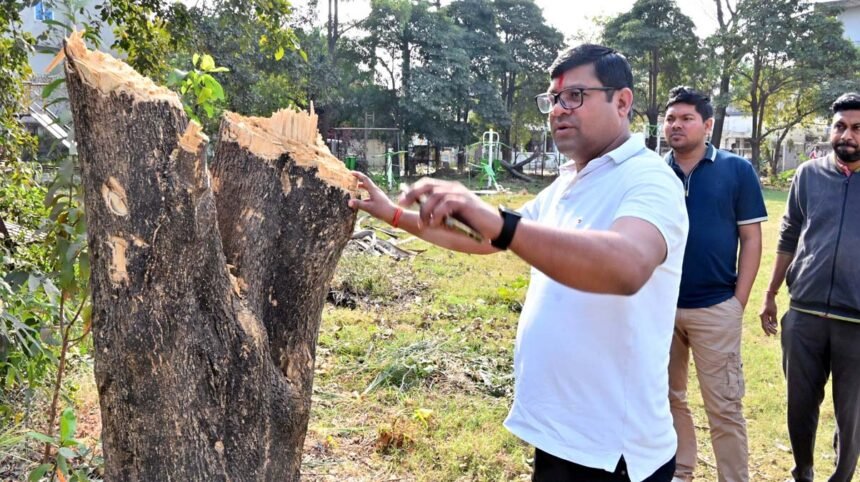 भिलाई। नगर पालिक निगम भिलाई क्षेत्र के स्मृति नगर कालोनी में जिला कलेक्टर रिचा प्रकाश चैधरी को स्थानीय निवासी विभा सिंह द्वारा शिकायत की गई थी। कि अज्ञात व्यक्तियों द्वारा स्मृति नगर उद्यान में अवैध रूप से बड़े-बड़े हरे-भरे पेड़ो को काटा जा रहा है। आयुक्त राजीव कुमार पाण्डेय, जोन आयुक्त अजय सिंह राजपूत के साथ नियमित भ्रमण पर निकले सब कार्यों के साथ उसका भी निरीक्षण करने गये। उसी समय वार्ड पार्षद मुकेश कुमार अग्रवाल, राणा सिंह, डा. निरज शर्मा एवं स्थानीय नागरिक पहुंच गये।