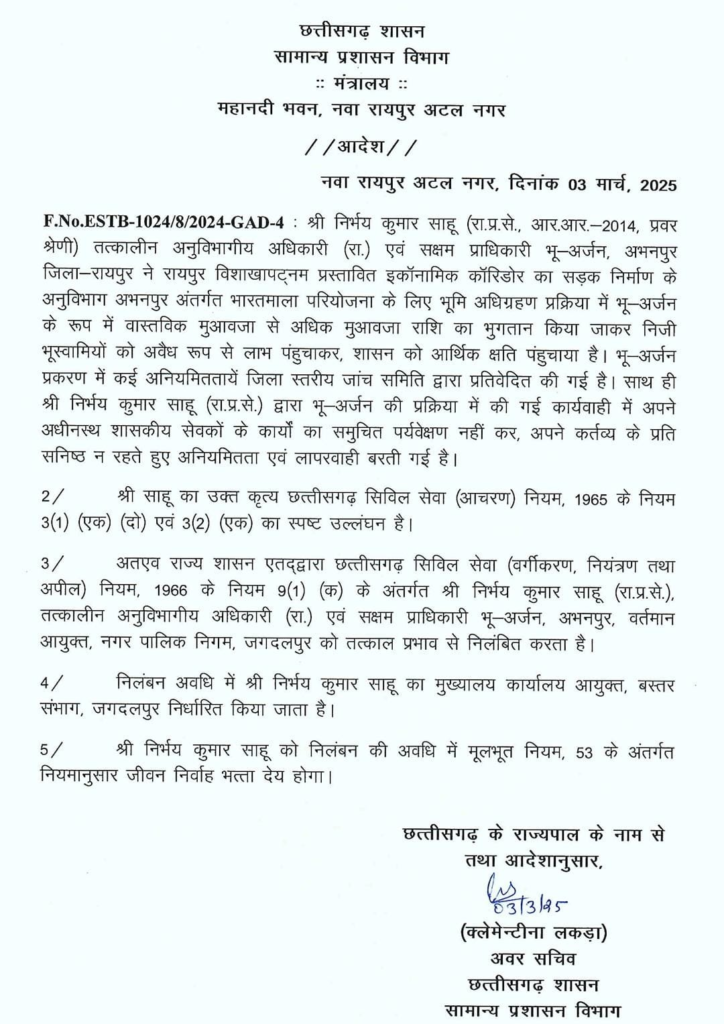 जारी आदेश में कहा गया है कि राज्य प्रशासनिक सेवा के अधिकारी निर्भय कुमार साहू अनुविभागीय अधिकारी (रा.) एवं सक्षम प्राधिकारी भू-अर्जन, अभनपुर के रूप में कार्यरत रहे। निर्भय कुमार साहू ने रायपुर विशाखापट्नम प्रस्तावित इकॉनामिक कॉरिडोर का सड़क निर्माण के अनुविभाग अभनपुर अंतर्गत भारतमाला परियोजना के लिए भूमि अधिग्रहण प्रक्रिया में भू-अर्जन के रूप में वास्तविक मुआवजा से अधिक मुआवजा राशि का भुगतान किया। इस तरह निजी भूस्वामियों को अवैध रूप से लाभ पंहुचाकर सरकार को आर्थिक क्षति पंहुचाने का काम किया है।