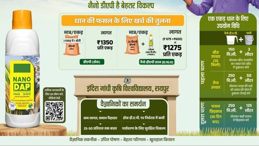 नैनो डीएपी एक आधुनिक, किफायती और प्रभावशाली तरल उर्वरक है, जो पारंपरिक डीएपी की तुलना में कहीं अधिक उपयोगी और पोषक तत्वों से भरपूर है। इंदिरा गांधी कृषि विश्वविद्यालय, रायपुर के वैज्ञानिकों ने नैनो डीएपी का समर्थन करते हुए कहा है कि इसके उपयोग से खेती की लागत में कमी आती है। नैनो डीएपी खेत में पोषण की कमी को प्रभावी ढंग से पूरा करता है और उत्पादन की गुणवत्ता को भी बढ़ाता है। नैनो डीएपी पर्यावरण के लिए भी सुरक्षित है। एक एकड़ धान की फसल के लिए एक बोरी ठोस डीएपी का उपयोग होता है। जिसकी लागत 1350 रूपए होती हैै, जबकि एक एकड़ में 25 किलो ठोस डीएपी और 500 मिली नैनो डीएपी के मिश्रण का उपयोग किया जाए तो इसकी लागत घटकर 1275 रूपए आती है।
