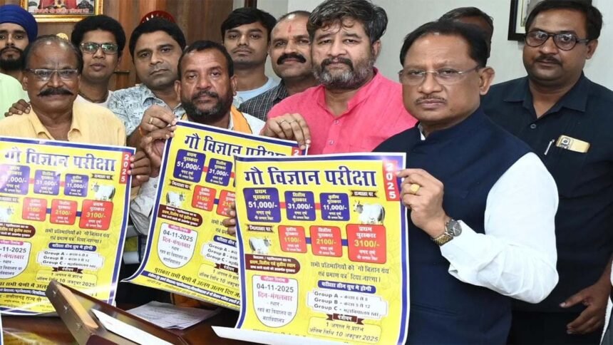 रायपुर। मुख्यमंत्री विष्णु देव साय ने आज अपने निवास कार्यालय में छत्तीसगढ़ राज्य गौ संरक्षण एवं संवर्धन समिति द्वारा आयोजित ‘गौ विज्ञान परीक्षा अभियान 2025’ का शुभारंभ किया। इस अवसर पर उन्होंने अभियान के पोस्टर का अनावरण किया और समिति के सदस्यों को इस पुण्य कार्य के लिए शुभकामनाएँ एवं बधाई दी।