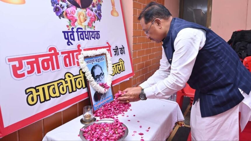 रायपुर। मुख्यमंत्री विष्णु देव साय सोमवार को राजधानी रायपुर के पुलिस लाइन स्थित रायपुर की पहली महिला विधायक एवं समाजसेवी रजनी ताई उपासने के निवास पहुँचे और उन्हें श्रद्धांजलि अर्पित की। उन्होंने रजनी ताई उपासने के योगदानों का पुण्य स्मरण किया तथा शोक संतप्त परिजनों से भेंट कर उन्हें सांत्वना दी। इस अवसर पर पूर्व राज्यसभा सांसद कैलाश सोनी, संतोष शर्मा, जगदीश उपासने सहित परिजन उपस्थित थे।