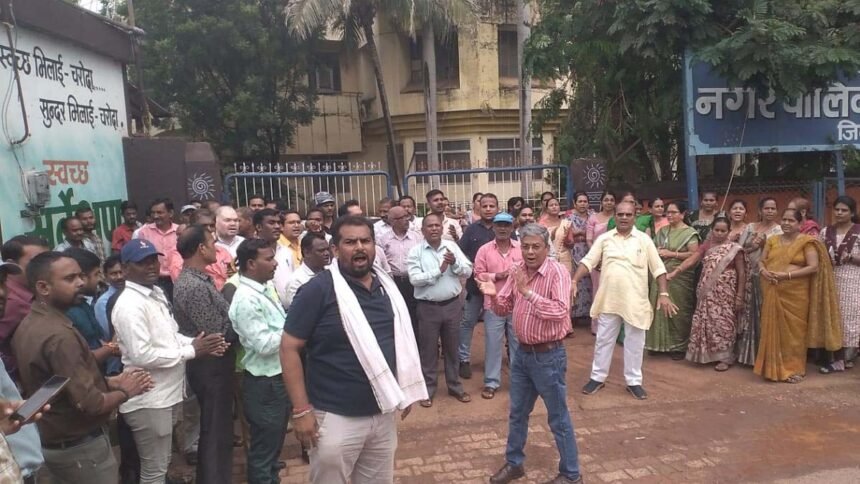 भिलाई। तीन महीने का वेतन नहीं मिलने से आर्थिक समस्या का सामना कर रहे भिलाई-चरोदा नगर निगम के कर्मचारियों का आक्रोश आज फूट पड़ा। सुबह समूह में पहुंचे कर्मचारियों ने निगम के भिलाई-3 स्थित मुख्य कार्यालय के प्रवेश द्वार पर ताला जड़कर बाहर धरना प्रदर्शन शुरू कर दिया। इस बात की जानकारी लगते ही महापौर निर्मल कोसरे और निगम आयुक्त डीएस राजपूत भागे-भागे कार्यालय पहुंचे। महापौर ने कर्मचारियों के प्रतिनिधिमंडल से चर्चा हेतु अपने कक्ष में आमंत्रित किया।