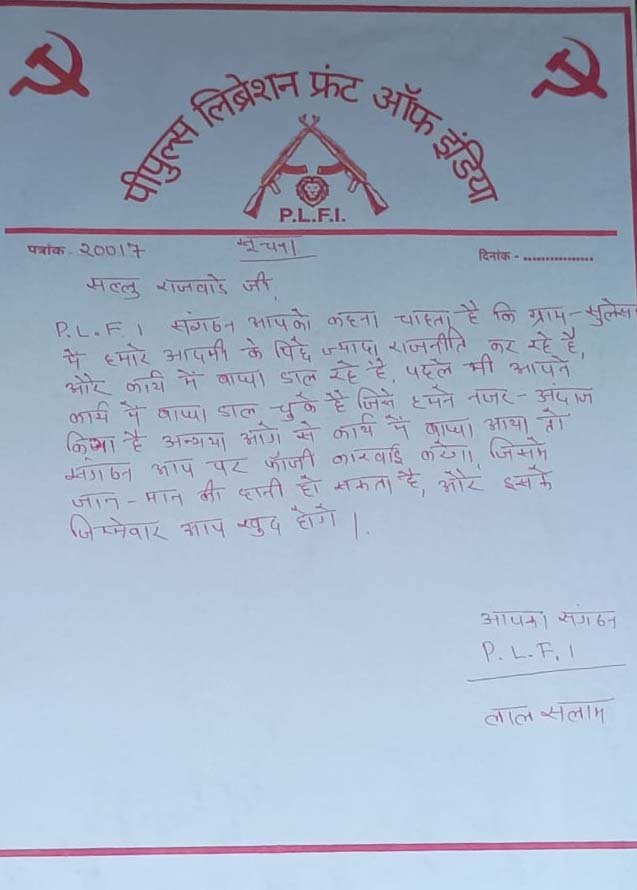 पीएलएफआई संगठन के नाम से मिले कथित पत्र में लिखा है कि सल्लु राजवाडे जी पीएलएफआई संगठन आपको कहना चाहता है कि ग्राम सुलेशा में हमारे आदमी के पीछे ज्यादा राजनीति कर रहे हैं और कार्य में बाधा डाल रहे हैं। पहले भी कार्य में बाधा डाल चुके हैं जिसे हमने नजरअंदाज किया है। आगे से कार्य में बाधा आया तो संगठन आप पर फौजी कार्रवाई करेगा जिससे जान मान की हानि हो सकता है और इसके जिम्मेवार आप खुद होंगे।