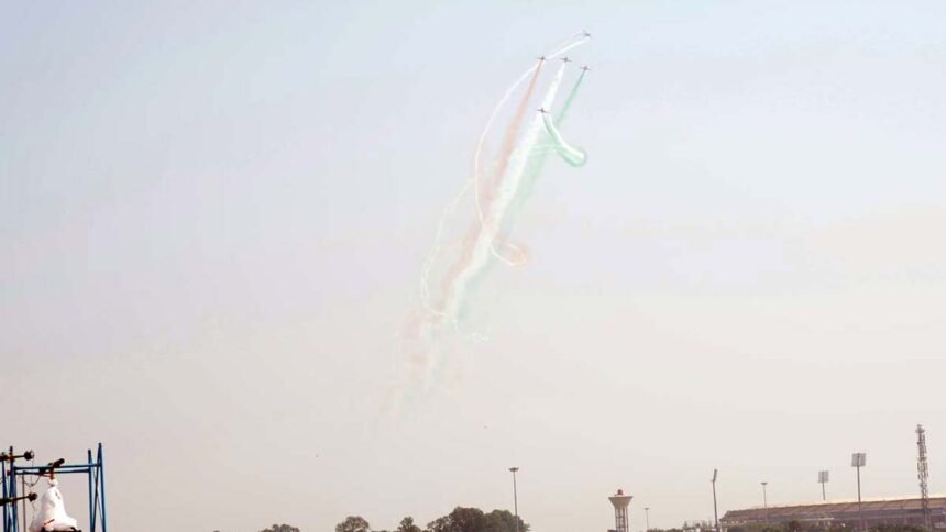 सूर्यकिरण की टीम ने ‘हार्ट इन द स्काई पेश किया। आसमान में दिल जैसा नजारा दिखा। इसके साथ ही टीम ने ‘बॉम्ब बस्र्ट और ‘एरोहेड जैसे रोमांचक फॉर्मेशन पेश किया। 9 हॉक एमके-132 फाइटर जेट्स एक साथ आसमान में उड़ान भर रहे हैं। टीम ने आसमान में तिरंगा भी दिखाया। इसके साथ ही ‘बॉम्ब बस्र्ट ‘हार्ट इन द स्काई और ‘एरोहेड जैसे रोमांचक फॉर्मेशन पेश कर रहे हैं। यह एक ऐसा नजारा था जिसे देखने के लिए दूर दूर से लोग पहुंचे थे।