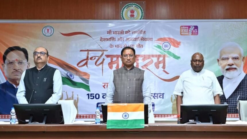 रायपुर। ‘वंदे मातरम्’ राष्ट्रगीत की 150वीं वर्षगांठ के अवसर पर शुक्रवार को देशभर में विविध कार्यक्रमों का आयोजन किया गया। इस ऐतिहासिक दिन को छत्तीसगढ़ में भी बड़े उत्साह और गर्व के साथ मनाया गया। मुख्यमंत्री विष्णु देव साय ने मंत्रालय महानदी भवन में वरिष्ठ अधिकारियों एवं कर्मचारियों के साथ सामूहिक रूप से ‘वंदे मातरम्’ का गायन किया। इस अवसर पर सभी ने “वंदे मातरम्” के उद्घोष के साथ आज़ादी की राष्ट्रीय चेतना का पुण्य स्मरण किया और अमर बलिदानियों को नमन किया। मुख्यमंत्री साय ‘वंदे मातरम्’ की 150वीं वर्षगांठ पर नई दिल्ली में आयोजित स्मरणोत्सव में वर्चुअली शामिल हुए और प्रधानमंत्री का उद्बोधन भी सुना।