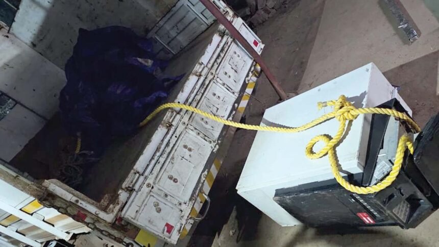 भिलाई। दुर्ग जिले के नंदिनी थाना क्षेत्र में बीती रात चोरों ने पूरा एटीएम मशीन ही उखाड़ लिया। एटीएम मशीन को मेटाडोर में लोड भी किया और बाद में उसे गाड़ी के साथ छोड़कर भागना पड़ा। दरअसल वारदात को अंजाम देने के बाद वे भागने वाले थे इतने में बगल के मकान परिवार के लोग जाग गए और आवाज लगाई। यह देख चोर एटीएम मशीन व मेटाडोर छोड़कर भाग गए। घटना नंदनिी थाना क्षेत्र के ननकट्टी का है। घटना की सूचना के बाद पुलिस ने एटीएम मशीन व मेटाडोर को जब्त कर आरोपियों की तलाश शुरू कर दी है।