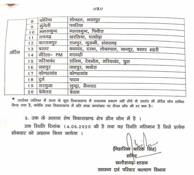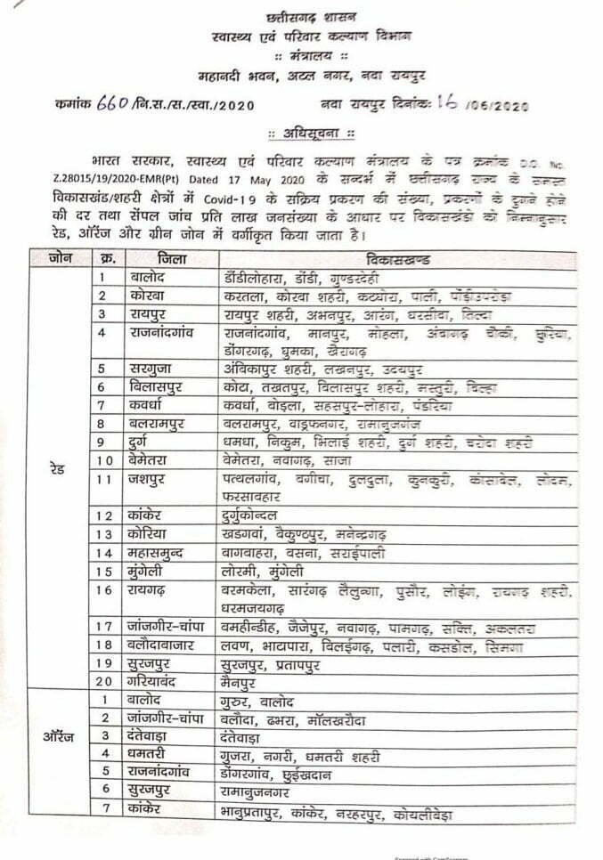 उल्लेखनीय है कि केन्द्रीय स्वास्थ्य एवं परिवार कल्याण मंत्रालय के दिशा-निर्देशों के मुताबिक प्रदेश के सभी विकासखंडों और शहरी क्षेत्रों में कोविड-19 के सक्रिय मामलों की संख्या, इनके दोगुने होने की दर तथा प्रति एक लाख जनसंख्या पर सैंपल जांच की ताजा स्थिति के आधार पर उन्हें रेड, ऑरेंज और ग्रीन जोन में पुन: वर्गीकृत किया गया है। स्वास्थ्य विभाग द्वारा 14 जून की स्थिति के आधार पर यह वर्गीकरण किया गया है। इसे हर सोमवार को अद्यतन किया जाएगा।