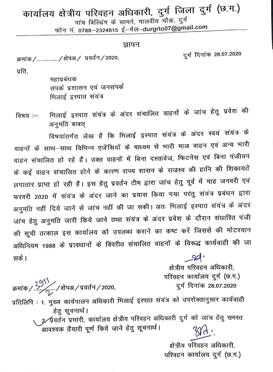 आरटीओ दुर्ग ने पत्र में कहा है कि बीएसपी के अंदर स्वयं संयंत्र के वाहनों के साथ-साथ विभिन्न एजेंसियों के माध्यम से भारी माल वाहन व अन्य भारी वाहन संचालित हो रहे हैं। इन वाहनों में दस्तावेज, फिटनेस और बिना पंजीयन के कई वाहन संचालित होने के कारण राज्य शासन को राजस्व की बड़ी हानि की शिकायत लगातार प्राप्त हो रही है। इसके लिए प्रवर्तन टीम द्वारा जांच के लिए पूर्व में जनवरी और फरवरी 2020 में संयंत्र के अंदर जाने का प्रयास किया गया परन्तु प्रबंधन द्वारा अनुमति नहीं दी गई। इसलिए जांच नहीं हो पाई। अभी दोबारा शिकायत मिली है जिसकी जांच होनी है। इसलिए प्रवेश की अनुमति दे।